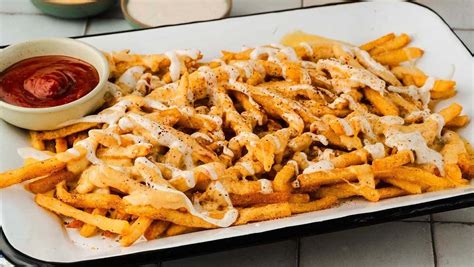 Skin On Fries Yang Diberikan Topping Cheese Dan Ranch Dressing.